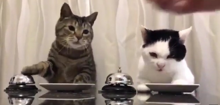 영상 속에는 두 마리의 고양이가 나란히 앉아 있다. 앞에는 그릇이 놓여 있고 한쪽에는 종이 각각 주어졌다. 먼저, 한 고양이가 종을 툭툭 치자 집사가 사료를 대령한다.