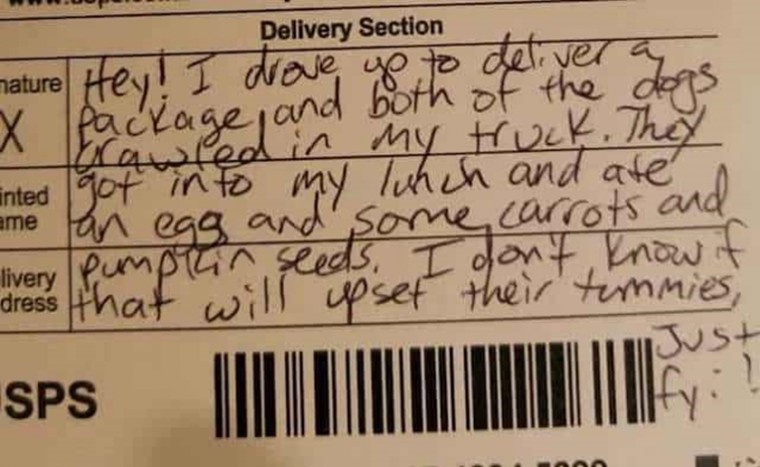 집배원이 우편물을 모두 돌리고 트럭으로 다시 돌아왔을 때, 그녀는 래브라도 2인조가 자신의 점심을 먹고 있는 것을 봐야만 했습니다.